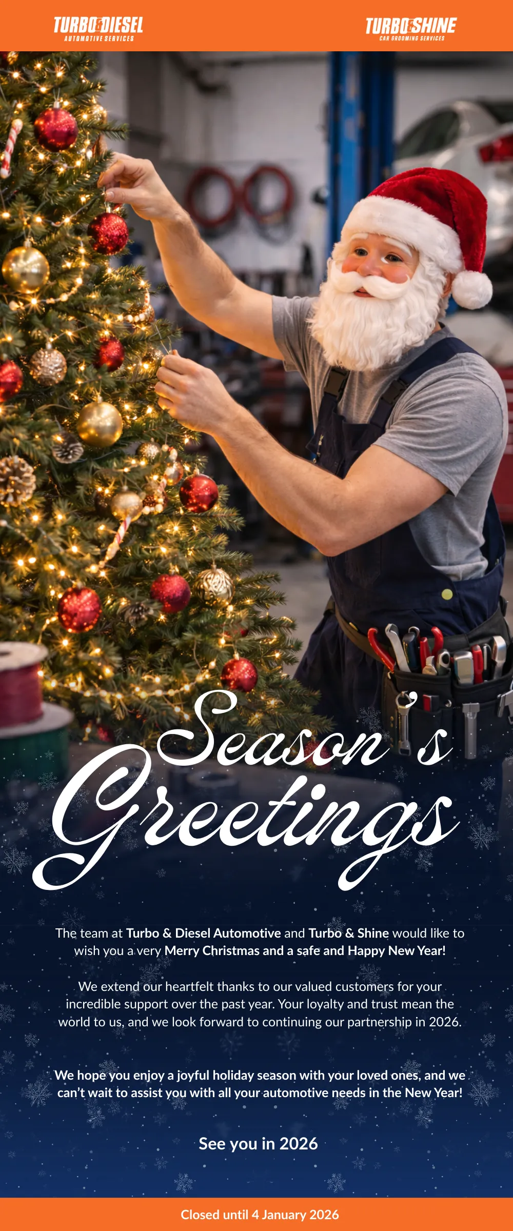 We wish you and your loved ones a very Merry Christmas and a safe, happy New Year. We look forward to continuing to care for your vehicle in 2026.